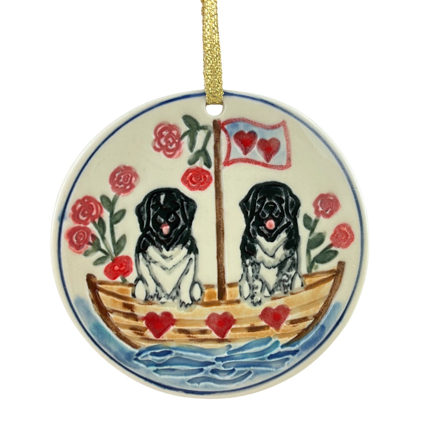 Celebrate love with this whimsical handmade porcelain ornament featuring two adorable Newfoundland dogs cozied up in a boat, floating among vibrant roses and hearts. Each piece is individually hand-painted with charming details and cheerful colors that bring warmth to any tree or display. Perfect for dog lovers and romantics alike, this delightful keepsake captures the joy of companionship and makes a thoughtful gift for Valentine's Day or any occasion worth treasuring.